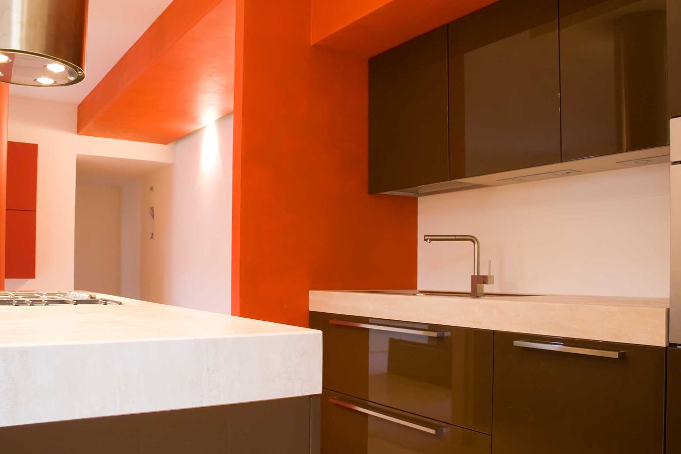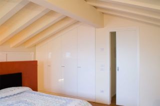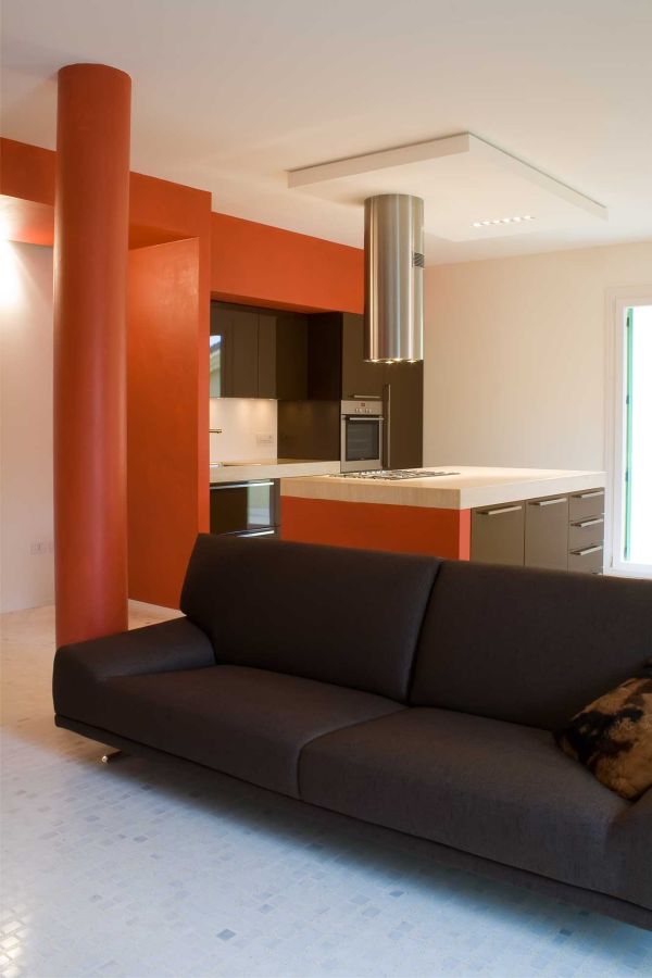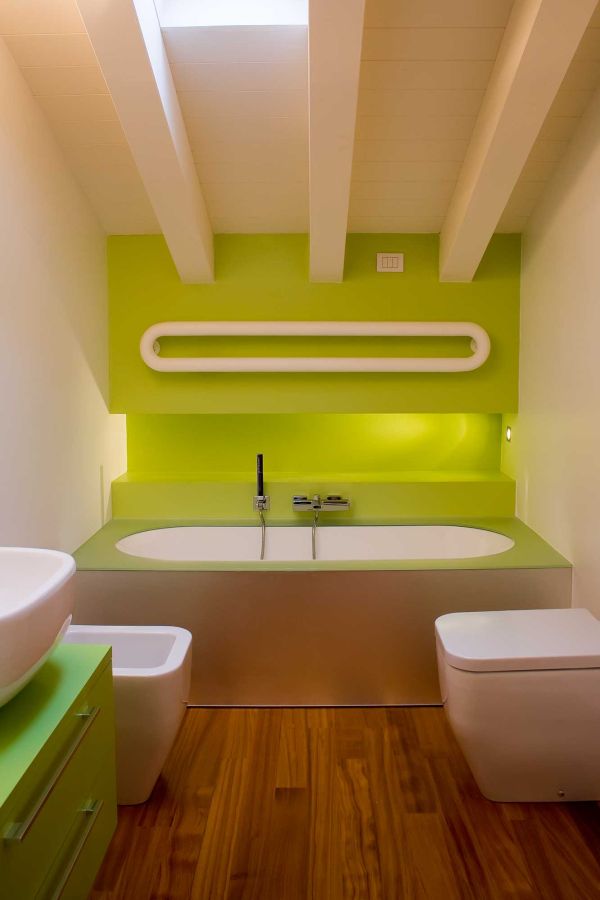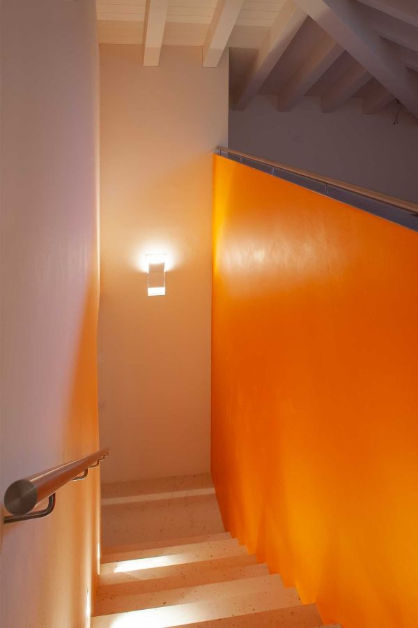 Una riqualificazione audace trasforma questa villetta a schiera in un'abitazione contemporanea su due livelli. Il piano mansardato è stato sapientemente ridisegnato per ospitare due camere e un bagno, mentre tutto l'intervento si distingue per le sue scelte cromatiche vibranti: rosso, verde acido e arancio dominano gli spazi creando un'atmosfera dinamica e personale.