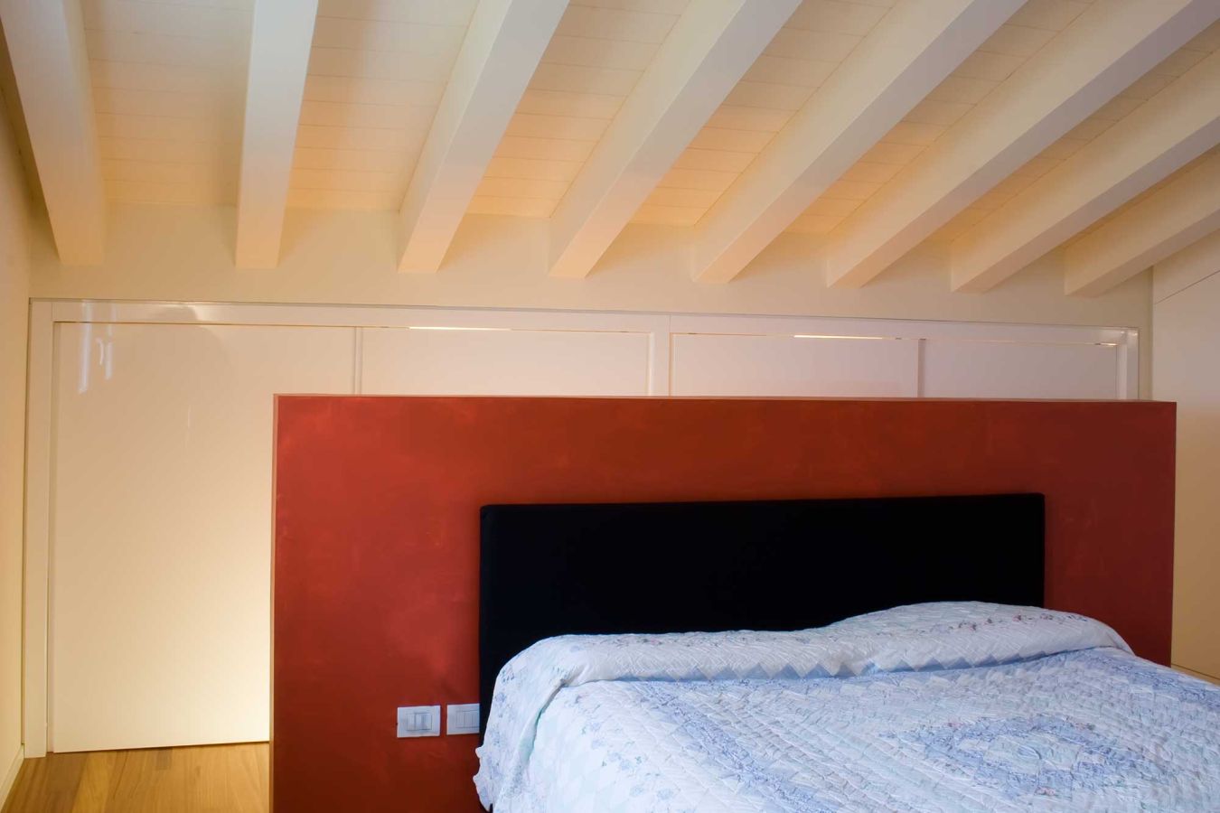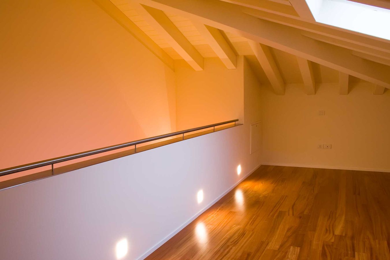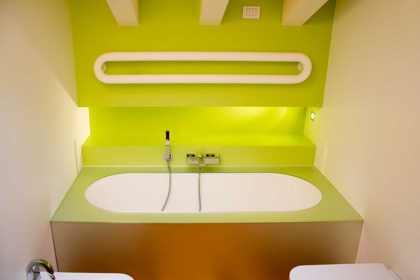 Una riqualificazione audace trasforma questa villetta a schiera in un'abitazione contemporanea su due livelli. Il piano mansardato è stato sapientemente ridisegnato per ospitare due camere e un bagno, mentre tutto l'intervento si distingue per le sue scelte cromatiche vibranti: rosso, verde acido e arancio dominano gli spazi creando un'atmosfera dinamica e personale.