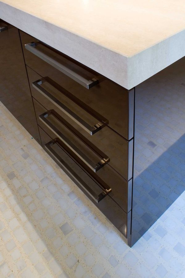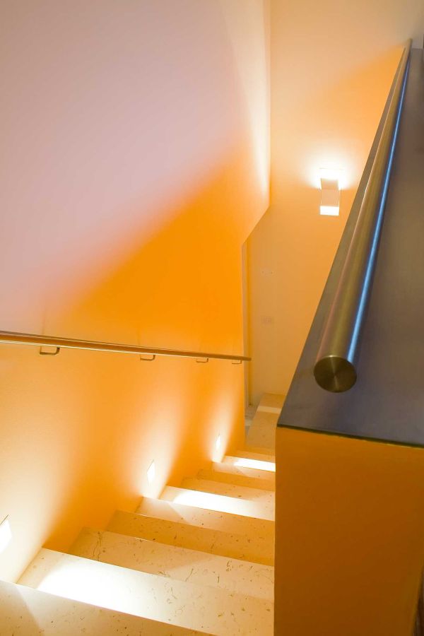 Il vero protagonista del progetto è il pavimento del living, un'opera d'arte contemporanea realizzata con oltre 64.000 tessere di marmo, tagliate e posate manualmente una ad una. Questo elemento unico trasforma il pavimento in un tappeto minerale che cattura l'attenzione e testimonia la cura maniacale per il dettaglio.
