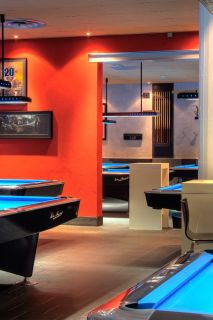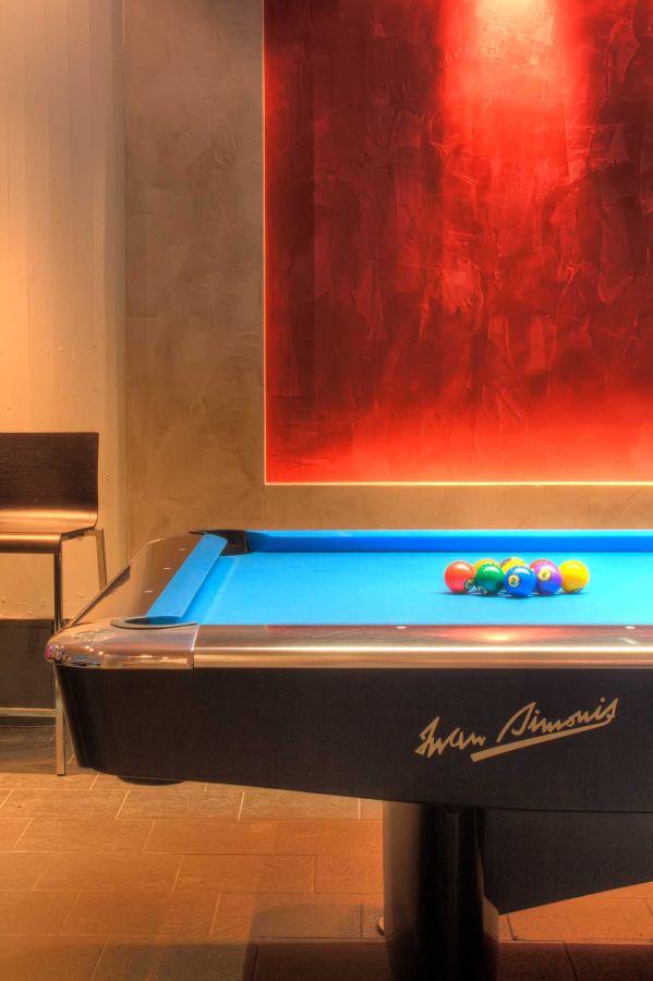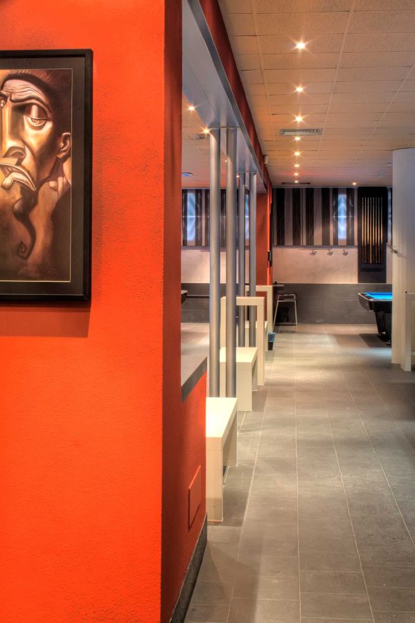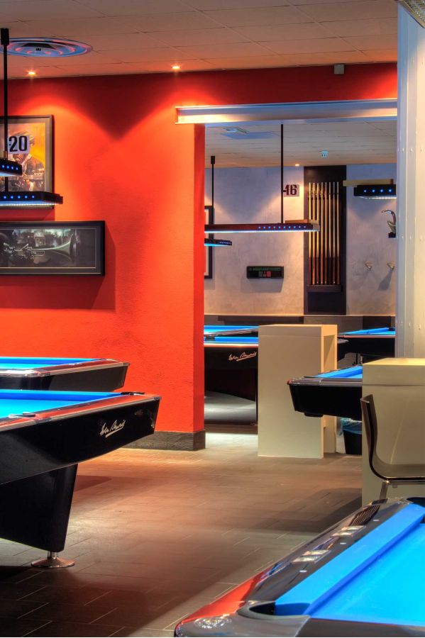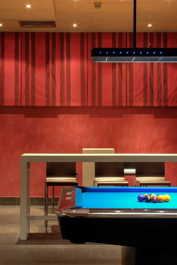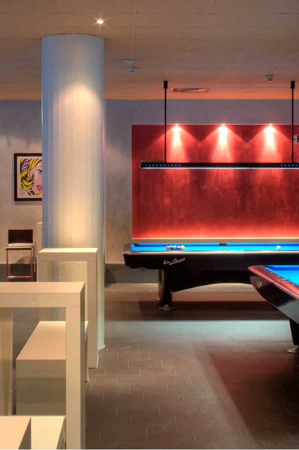 La ristrutturazione di questa sala biliardo si è concentrata su tre elementi chiave: il ridisegno delle pareti, l'inserimento di una struttura in acciaio che ridefinisce l'apertura tra gli ambienti, e la creazione di arredi custom-made, pensati e realizzati appositamente per valorizzare lo spazio.